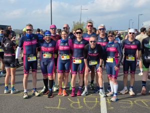 Quatre flamants roses , Caroline, Stephane, Patrick et Aline ont migré vers l’ouest pour clore cette saison de triathlon en beauté . En cette période des grandes marées, la météo est rarement clémente, mais là c’était carrément parfait ….. à part la température de l’eau qui n’affichait que 14 degrés et un vent de face …